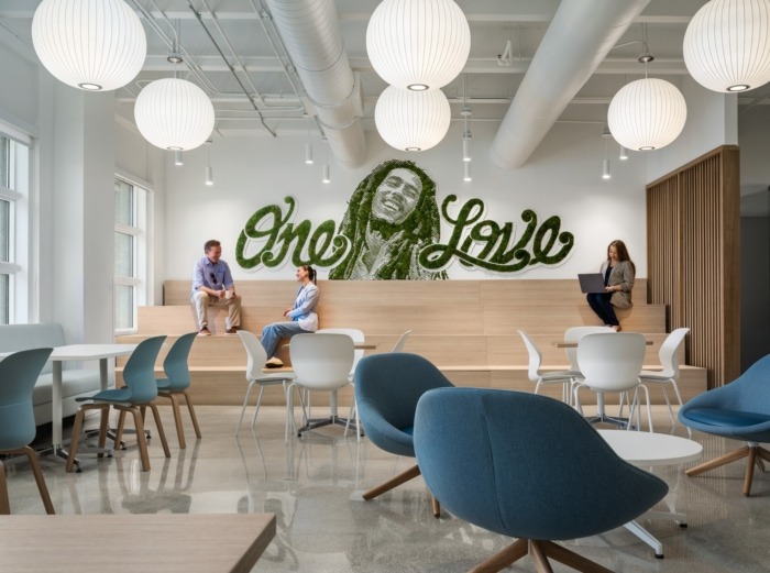 Không gian làm việc khuyến khích giao tiếp thông qua ba khu vực nghỉ giải lao, trong đó nổi bật là lounge tầng hai với bậc ngồi kiểu sân vận động và bức tranh tường chân dung huyền thoại reggae người Jamaica – Bob Marley.