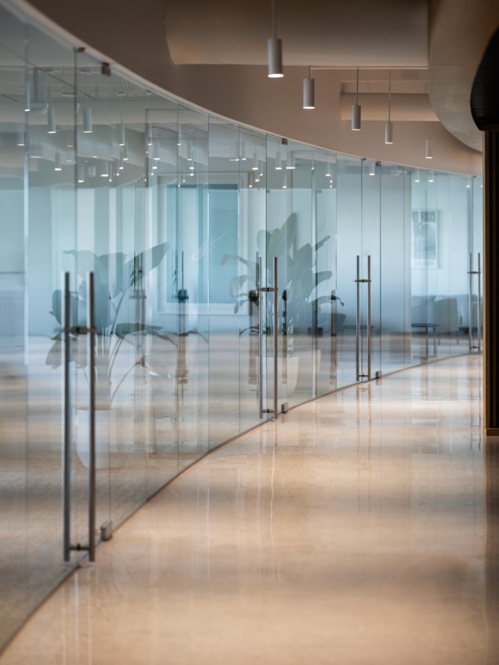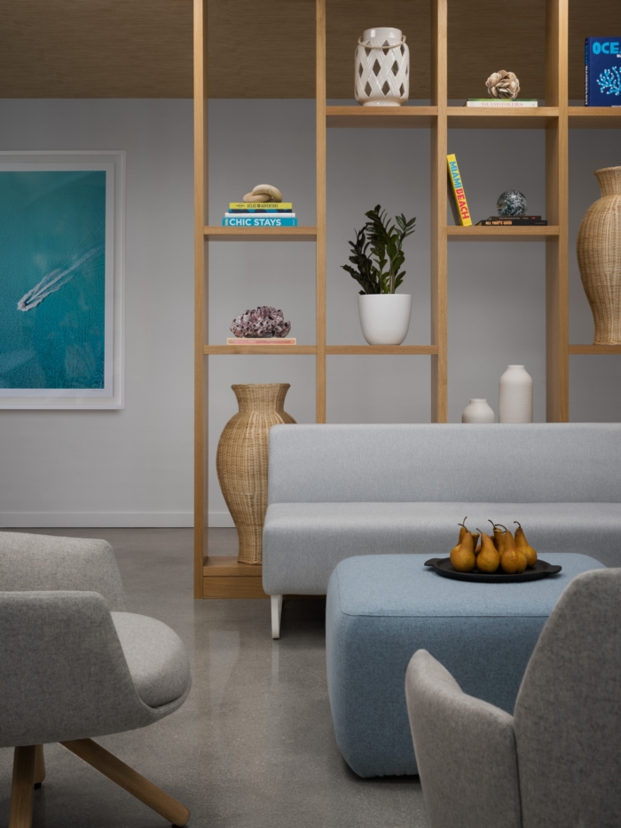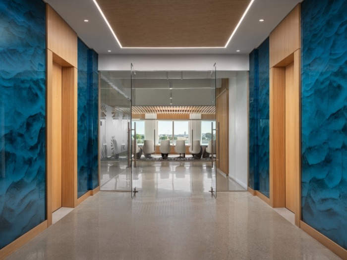 Ngay khi bước ra khỏi thang máy, nhân viên và khách ghé thăm được chào đón bằng những họa tiết sóng nước khắc trên kính, mở ra một trải nghiệm thị giác đậm chất biển đảo. Khu tiếp khách bên cạnh được trang trí bằng giấy dán tường sợi cỏ biển, sofa vải linen trắng và các chi tiết gỗ lũa – tất cả cùng tạo nên bầu không khí thư giãn như đang ở một resort vùng Caribe.