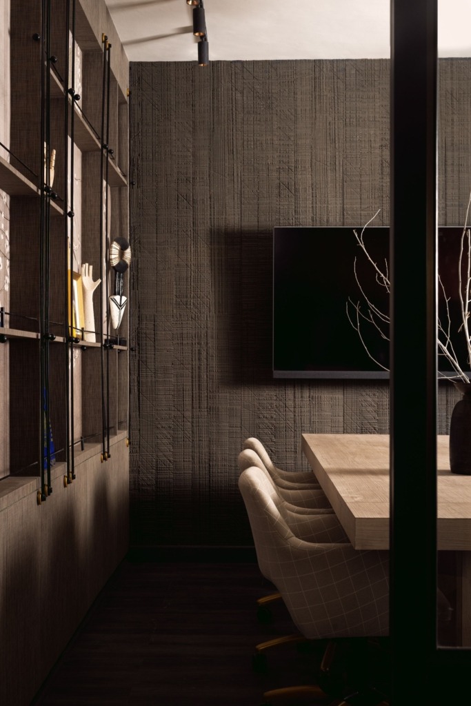 Phòng giám đốc là một không gian tạo dấu ấn riêng biệt với lớp kính bao quanh và màu đỏ thẫm chủ đạo. Ghế bọc da báo, vật phẩm sưu tầm và một góc ngồi yên tĩnh dành cho các cuộc trò chuyện riêng tư tạo nên bản sắc độc lập. Phòng họp cũng đi ngược tiêu chuẩn thường thấy khi sử dụng giấy dán tường hoa văn, mảng tường TV phủ vải và kệ mở để tăng cảm giác ấm áp và gần gũi thay vì khô khan theo kiểu văn phòng truyền thống.